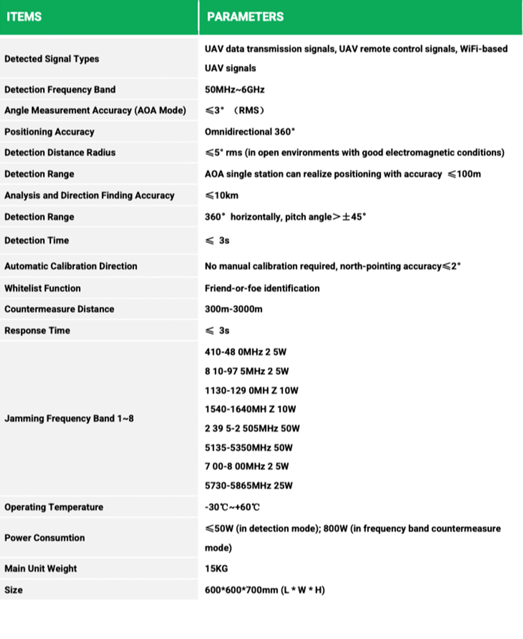 This product system is used for UAV detection, identification, and jamming. Integrating multiple technologies such as collaborative spectrum sensing and deep neural networks, the system realizes effective detection, identification, and azimuth tracking of low-altitude UAVs in the defense zone through radio detection technology, utilizing received UAV characteristic signals and big data processing. It achieves effective control over intruding UAVs by means of radio interference and blocking technology. The system provides low-altitude three-dimensional protection for defense areas with a radius of more than 5,000 meters and has been widely applied in fields such as government agencies, prison guard, airports, military restricted zones, and major events.