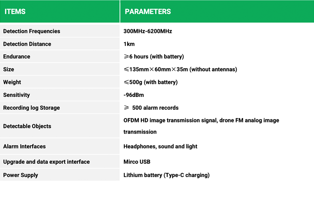 The portable drone detector adopts low power consumption design and highly integrated design. It is capable of detecting rotor drones using OFDM high-definition image transmission and various DIY crossing signals using analog image transmission, such as mainstream DJI and Autel. The product adopts dual antennas and multi-channel scanning at the same time, which has the characteristics of fast detection speed, high detection sensitivity, long detection distance, low false alarm rate, strong expansibility and convenient use.