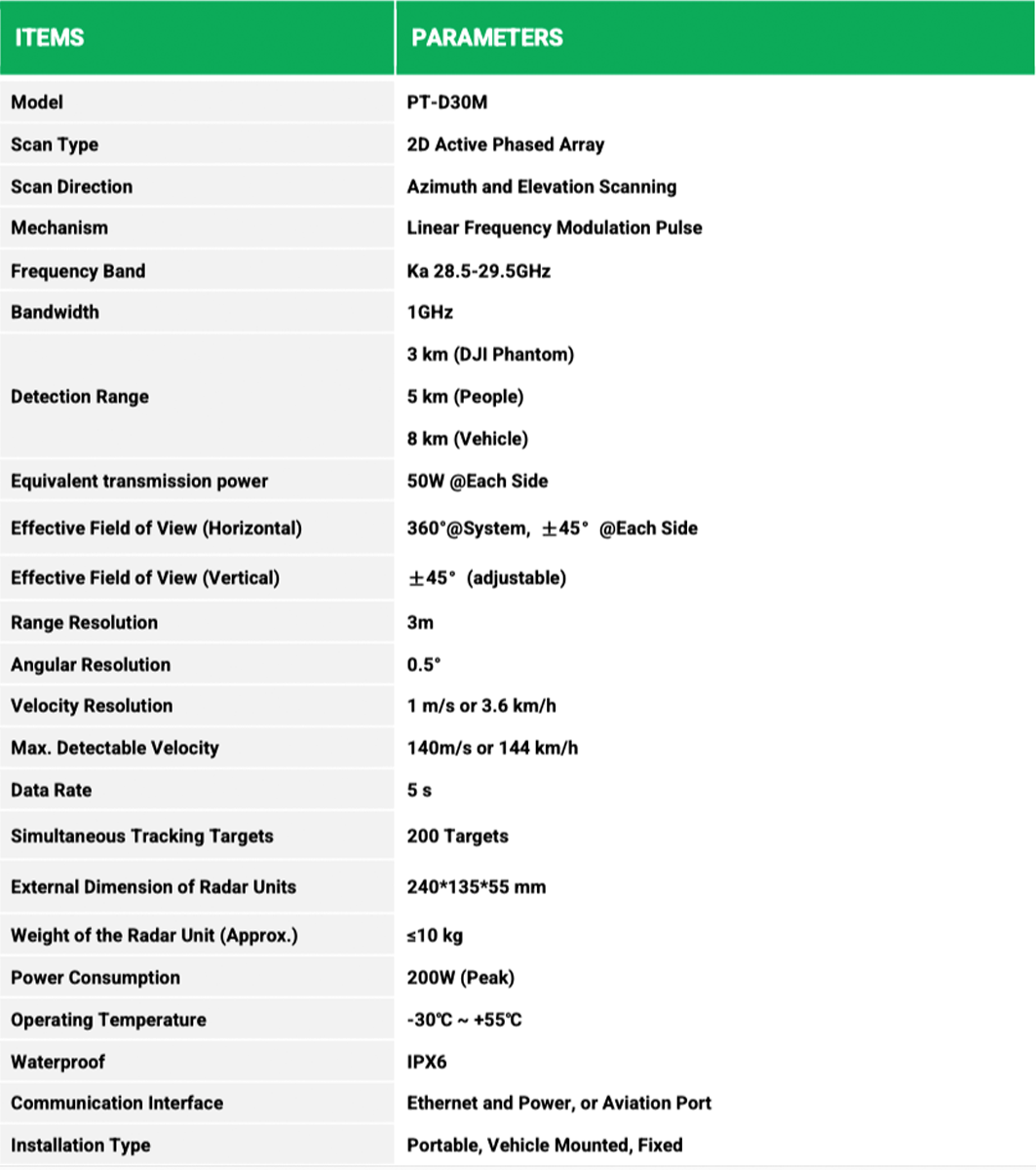 The PT-D30M Anti Drone Radar is an cost-effective 3D radar with great performance, supporting continuous detection of mini-UAVs up to 3 km. It has the capability to identify up to 200 targets simultaneously with distance, azimuth, height, and speed data. The product has the advantages of high detection accuracy, fast scanning speed, low false alarm rate and strong anti-interference ability. It is perfect for anti-UAV application for correctional facilities, airports, critical infrastructures, oil refineries, and national events etc.
